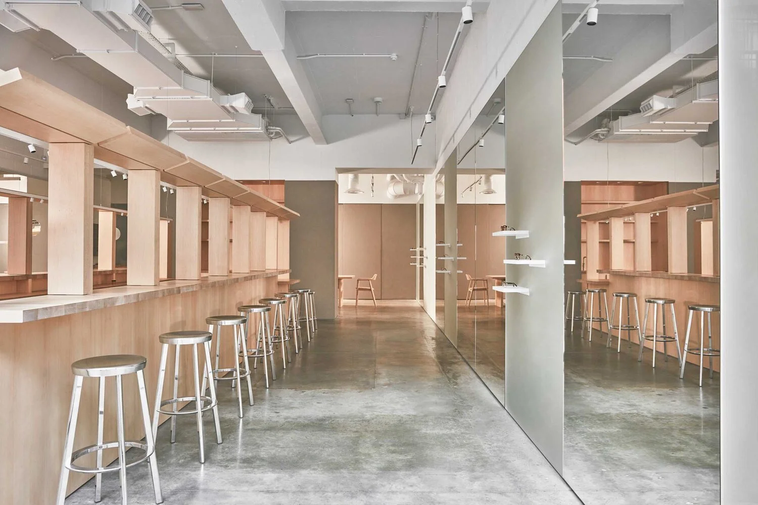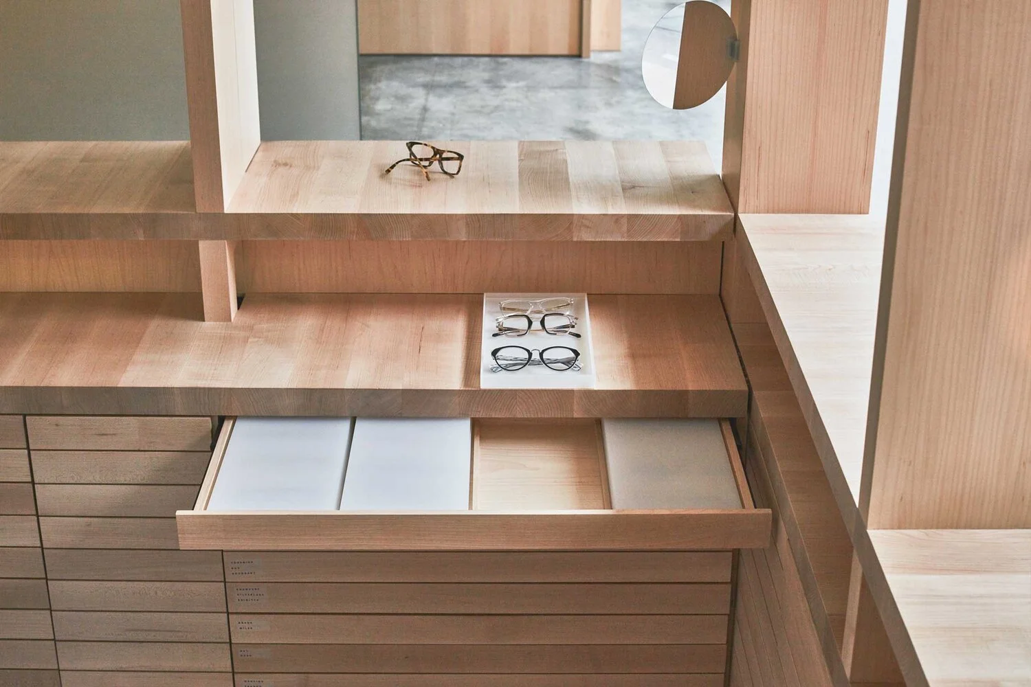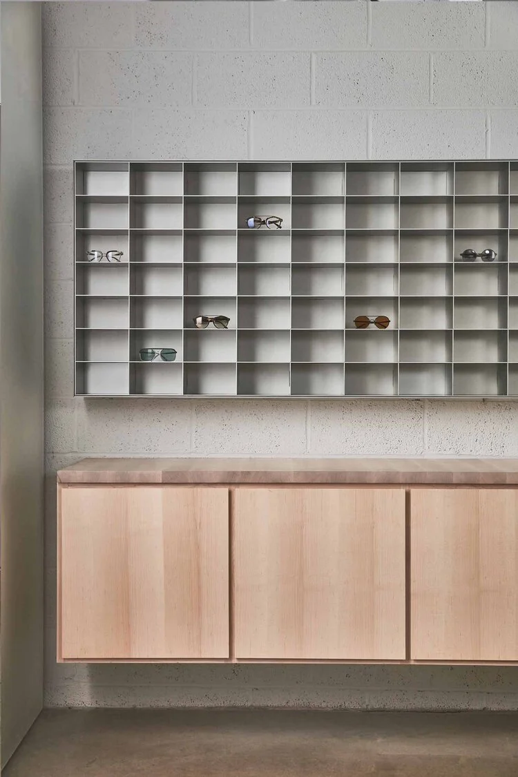 The store’s collection of frames is hidden from immediate view, held in the 200 drawers of the bar. A curated selection is carefully prepared and brought out for you. The honesty of experience is reflected in a simple palette of materials. Warm maple for the elements you touch and gather around, and textured bulletin board and etched silver mirrors wrap the existing blockwork walls, creating a tactile minimalism which brings the intricate detailing of the eyewear to foreground.