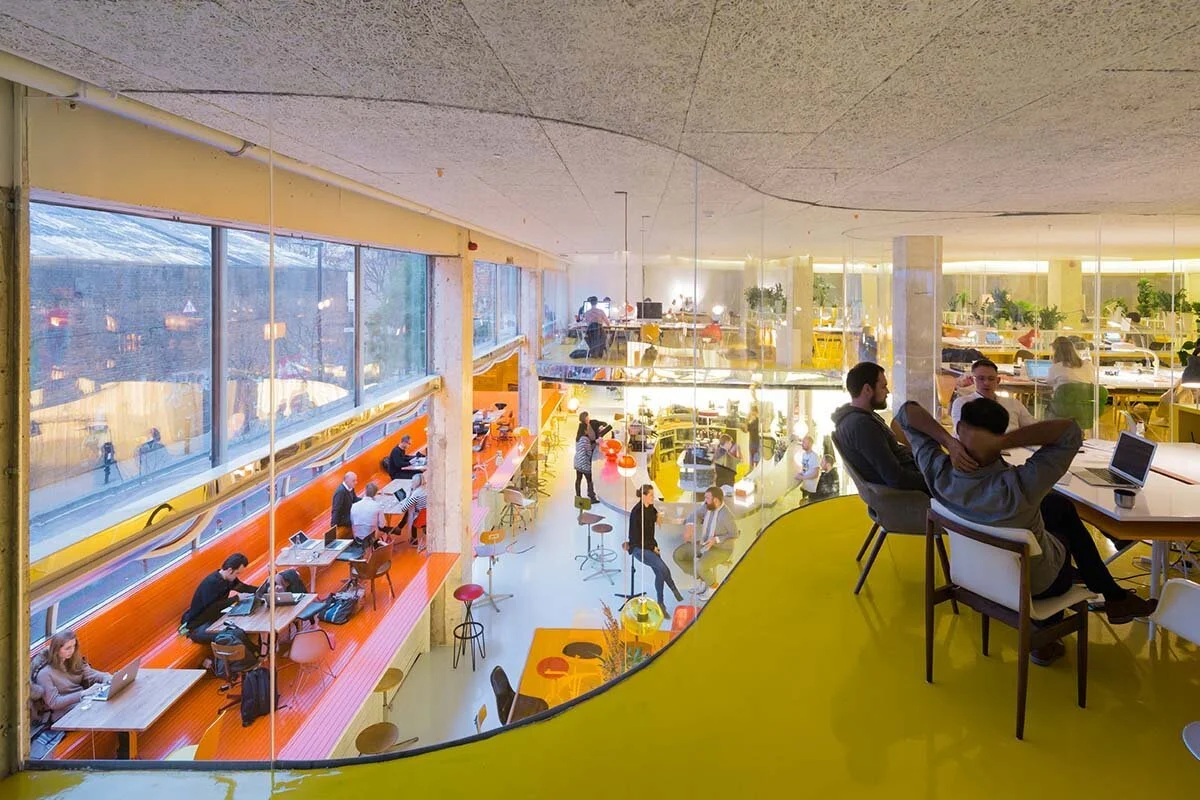 Second Home' is located near Spitalfields in East London. The concept consists of a workspace to host around 30 companies. There are a variety of rooms that can host from 5 to 75 people and are available to rent for long or short periods of time. There are also communal spaces that can be used by anyone. These include; seven meeting rooms, rest areas, a café-bar where coffee is free and where you can eat for £5 and a large open area where yoga, concerts, parties and other events take place.