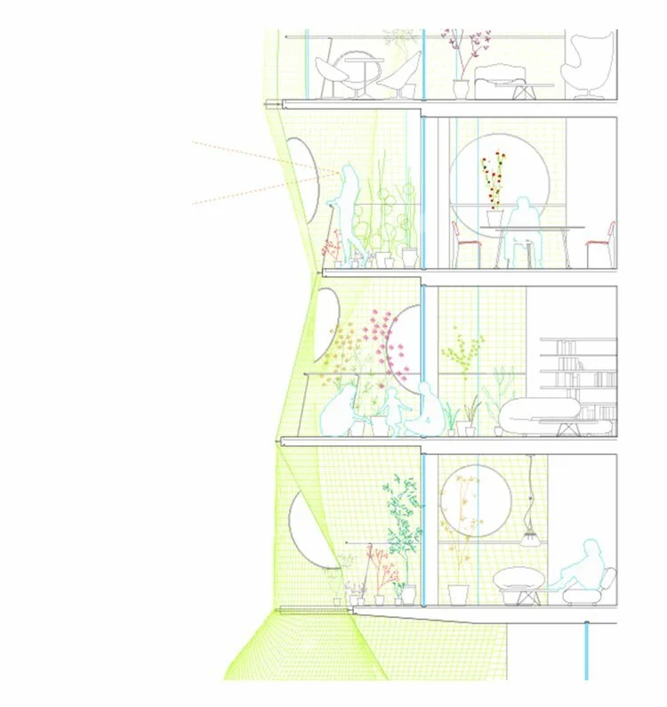 The varying depths of balconies offer a generous space for plants and stays, and their continuity means that you can always access nature from any room. On the continuous balconies there is the possibility to create a glazed outdoor room for each apartment.