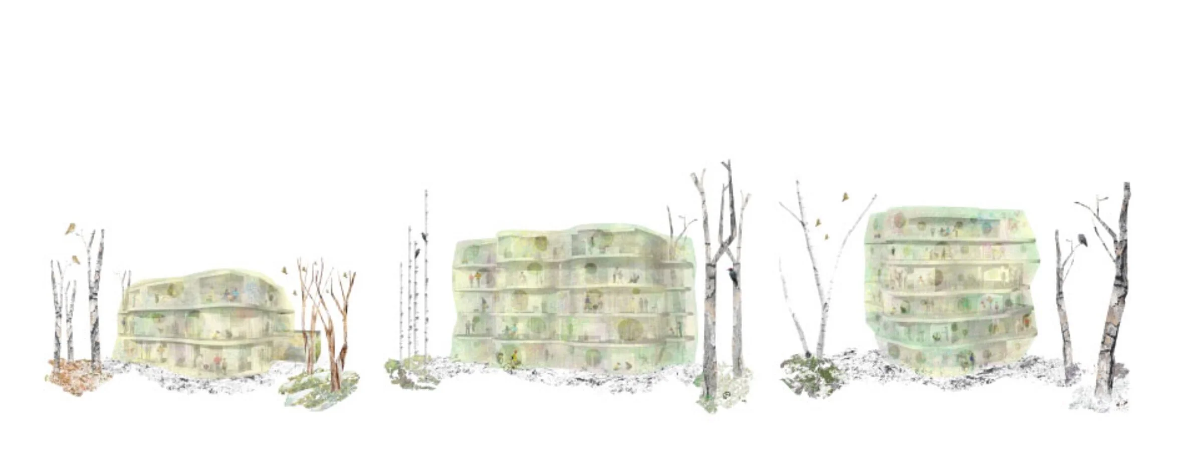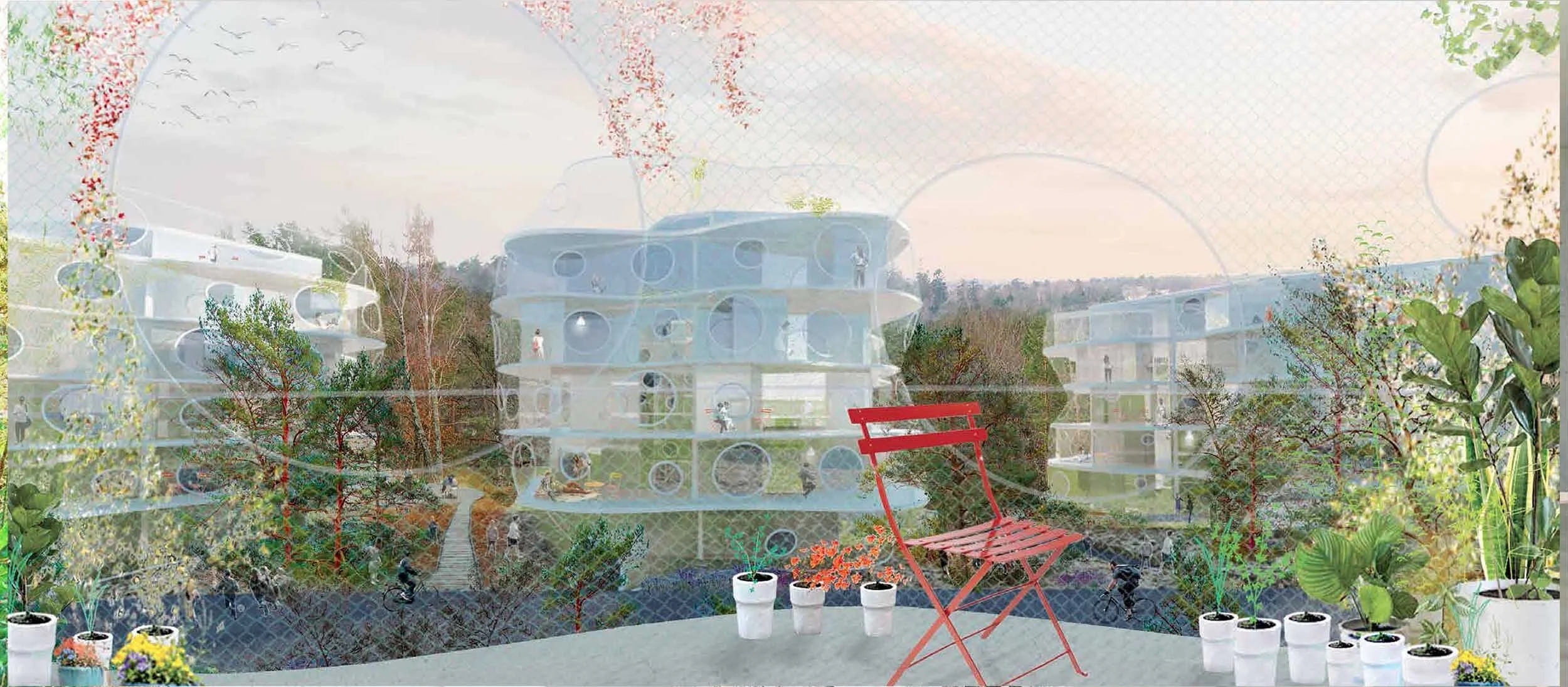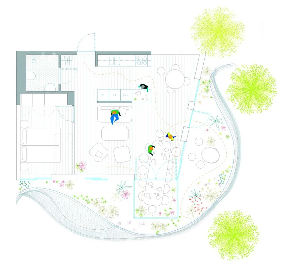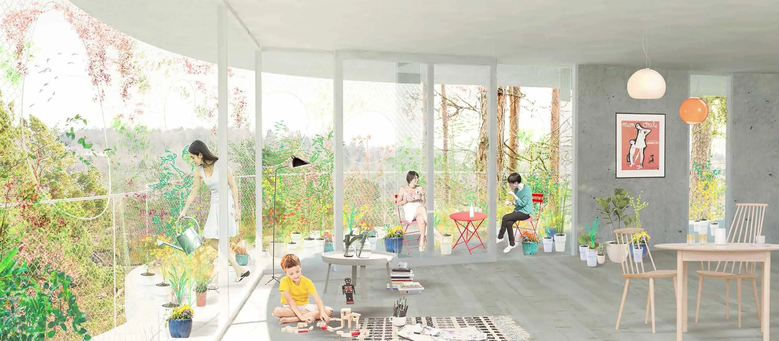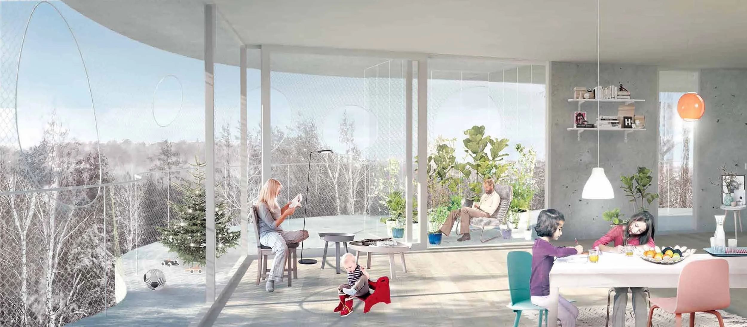 At the heart of the project is the gap between nature and the individual dwelling. This zone, in the form of large patios, terraces, balconies and glazed outdoor areas, gives each apartment a large contact area with nature. The space changes in character depending on time of day and year, weather and activities: greenhouses in spring and autumn, large banquet hall in summer when living room and terrace become one, gazebo on balcony during winter and reading corner in nature all year round. These living areas link the homes with nature and greenery. They enrich the living environment by connecting the residents with nature at different heights, from the ground level to the tree tops and the long views to the surroundings.
