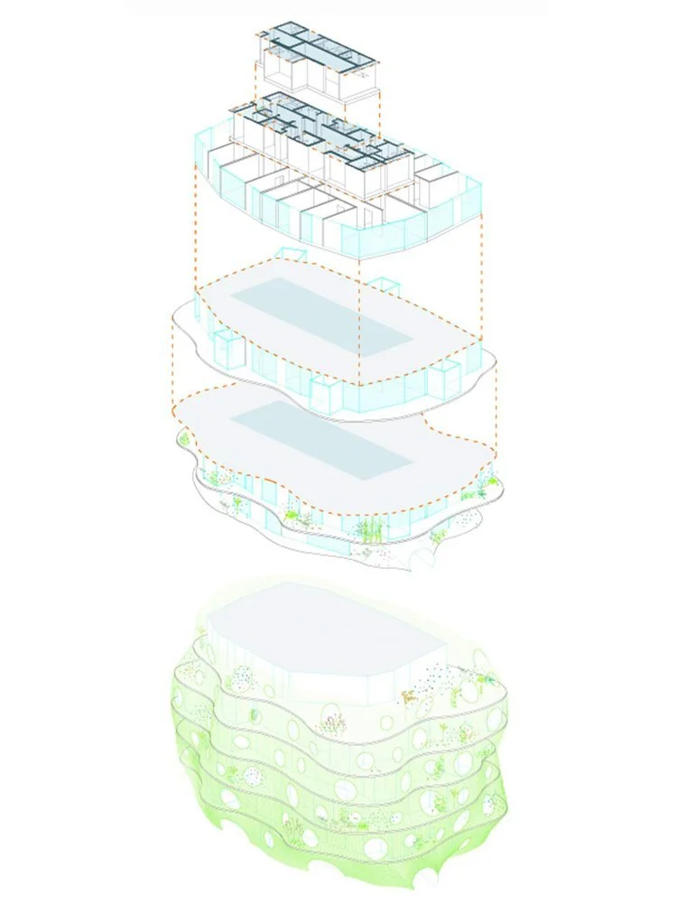 Glass screens that are stored side by side can be pulled out in different ways: from a pair of gables to create shelters to a fully closed winter garden, or a climate-protected extension of the living room. Patios are embraced by a network that varies in density and is perforated with larger openings at selected locations. Tighter densities provide security at the railings and smoother densities make the net almost invisible. The network also provides the opportunity to create its own lush plant wall.